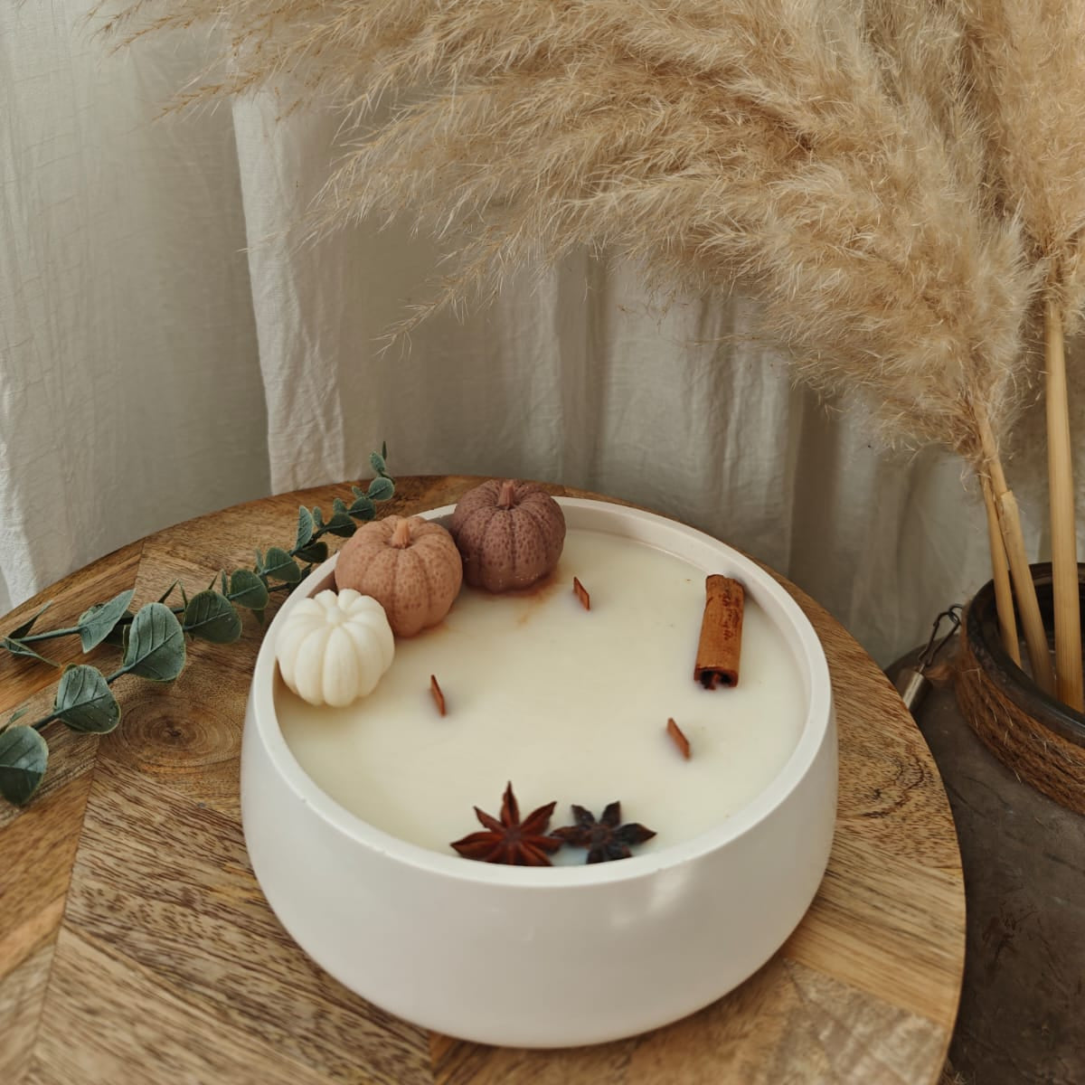 Coulée à la main dans un pot en jesmonite, cette bougie XXL mêle esthétique et authenticité : de véritables morceaux de cannelle, des étoiles de badiane et de petites citrouilles en cire viennent sublimer sa surface.