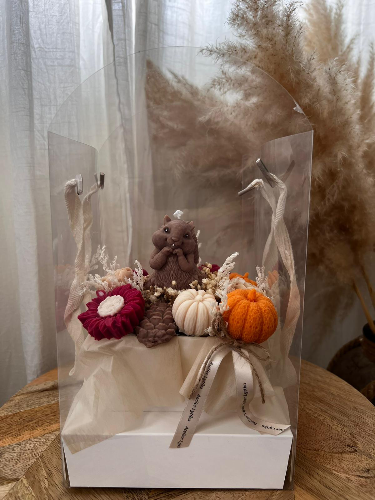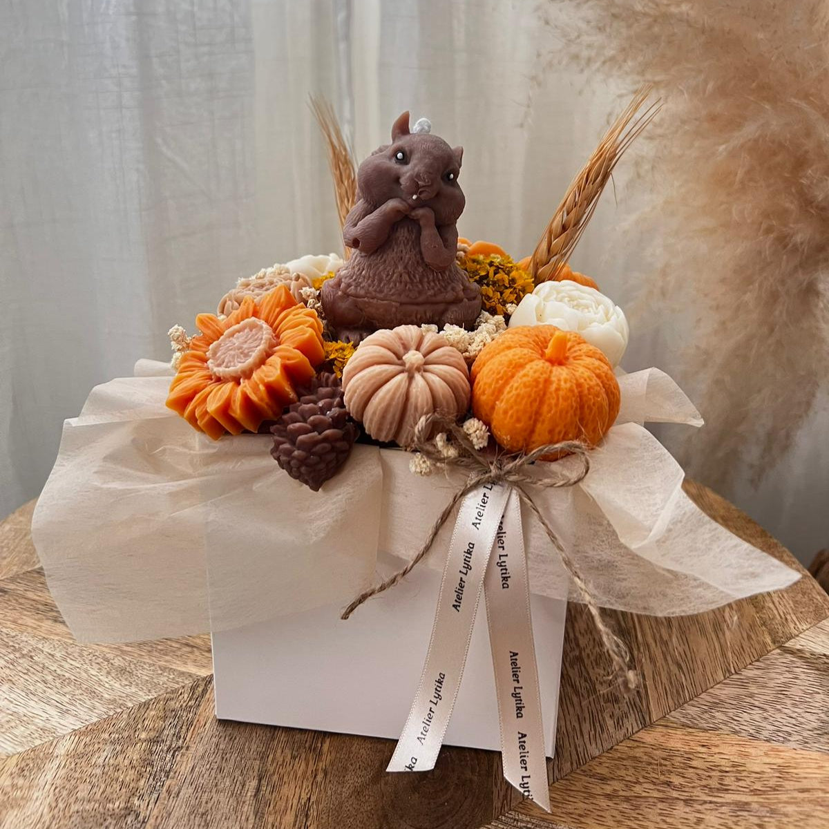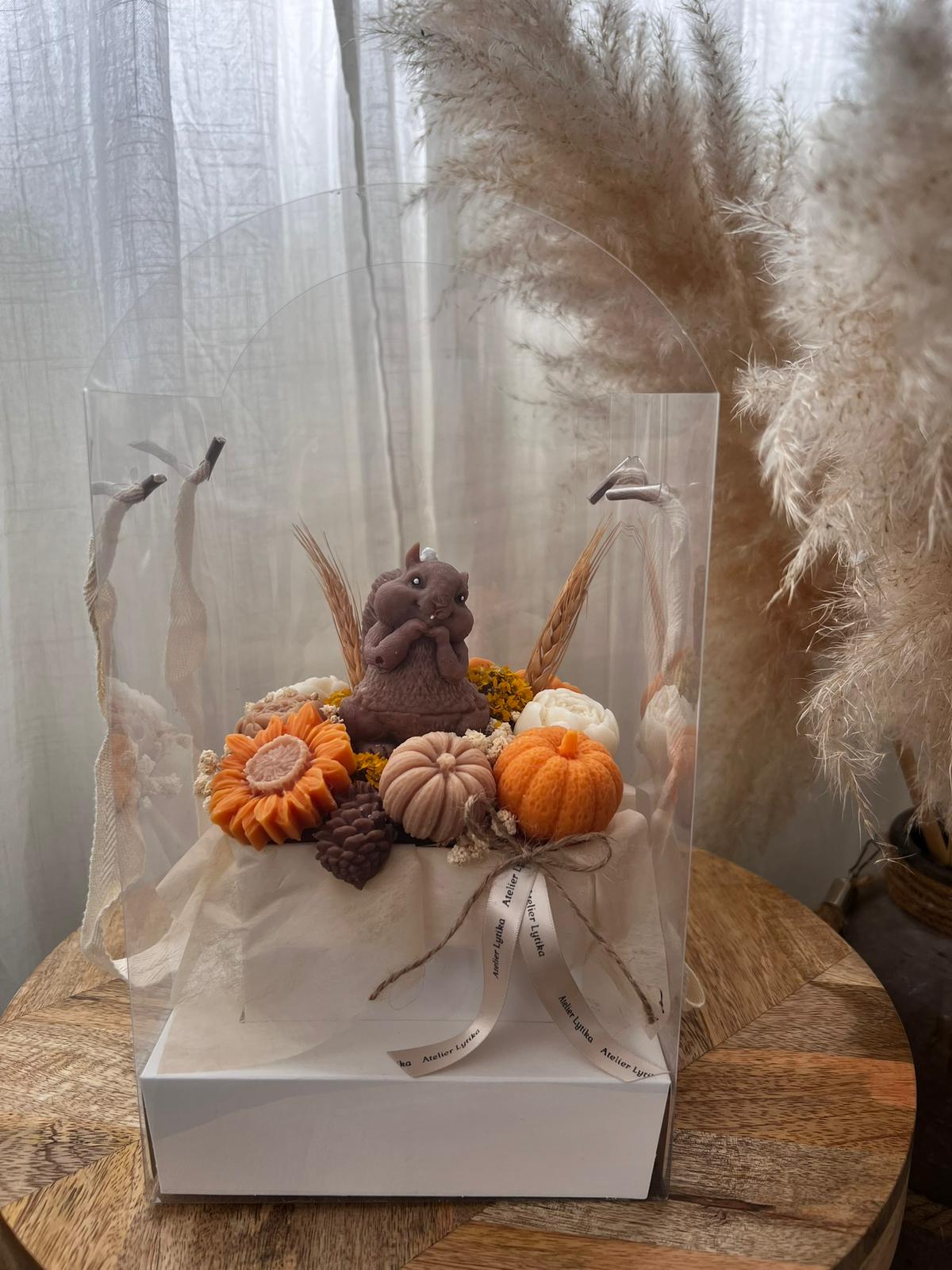 Un petit écureuil en cire, malicieux et attendrissant, trône au milieu de mini-citrouilles, de fleurs en cire et de délicates touches séchées.